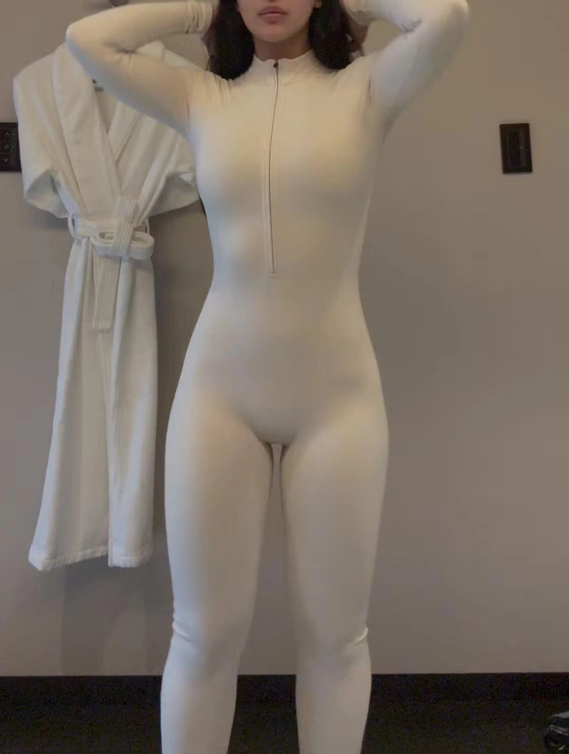 Der verbesserte Langarm-Reißverschluss-Overall hat eine Fleece-Innenseite – gemütlicher und dicker für kaltes Wetter. Mit einem einfachen Halbreißverschlusskragen und einer taillierten Silhouette, die Ihre Taille betont, besteht er aus butterweichem Stoff, der sich wie eine zweite Haut anfühlt und Sie warm hält.
